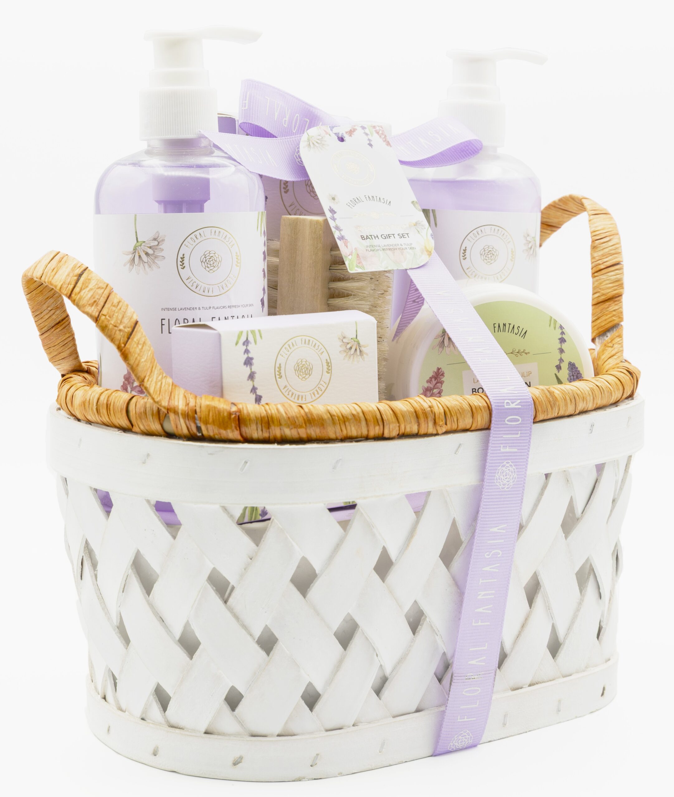 Incluye una cuidada selección de productos de baño presentados en una elegante cesta de mimbre blanco con asa trenzada y cinta decorativa en tono lavanda. Ideal para regalar o para disfrutar en casa, esta cesta transforma tu rutina de baño en una experiencia sensorial única, dejando la piel suave, hidratada y delicadamente perfumada.