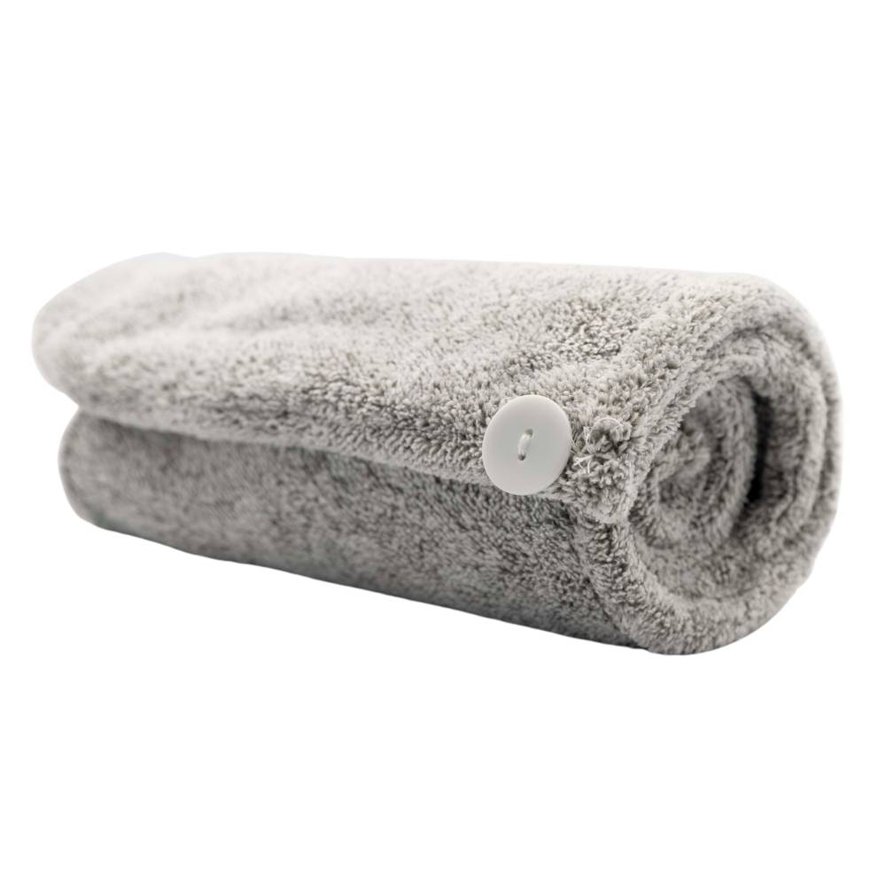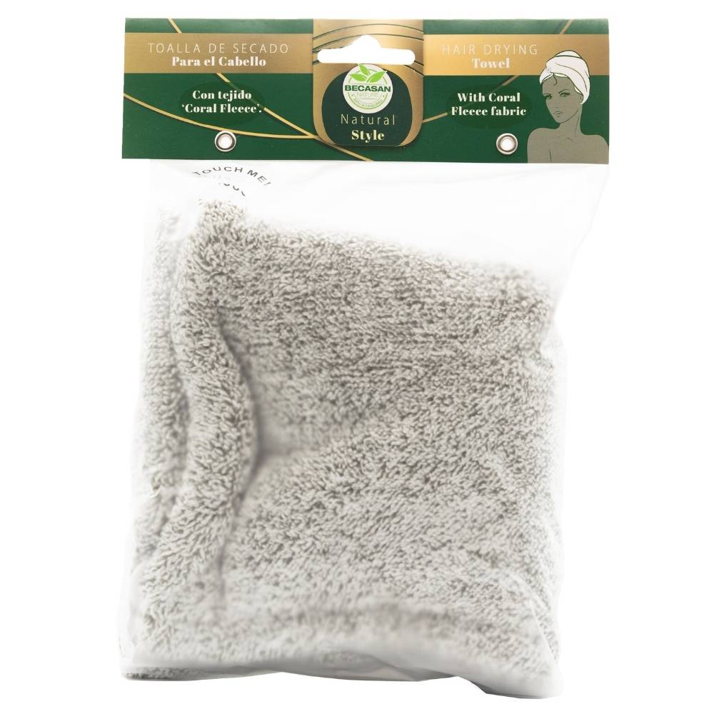 Elaborada con fibras naturales. Forma un turbante en tu cabeza y el el botón para un secado rápido y cuidadoso.